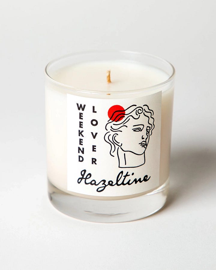 This candle is my all-time favorite candle brand, Hazeltine. My favorite scent of theirs is Pasadena, but I recently bought Weekend Lover, named for the musician, Prince. It’s very purple rain, velvet vibes. I’ve taken little bits of the wax and used it like perfume since I got it, if that tells you anything. These would be great Christmas gifts, and they’re from a local small business, which we LOVEEEEEE.